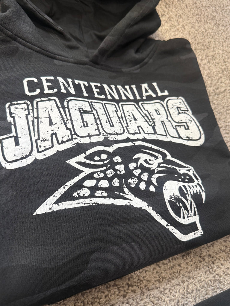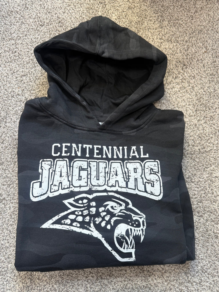 Black and gray camo youth hoodie with distressed Centennial Jaguars design. Unisex sizing. Model (aka my son) is wearing a youth medium and is 4'3 and 70ish lbs.