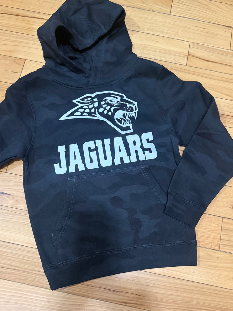 Youth black and gray camo hoodie with a solid jaguars design and logo. Unisex sizing.